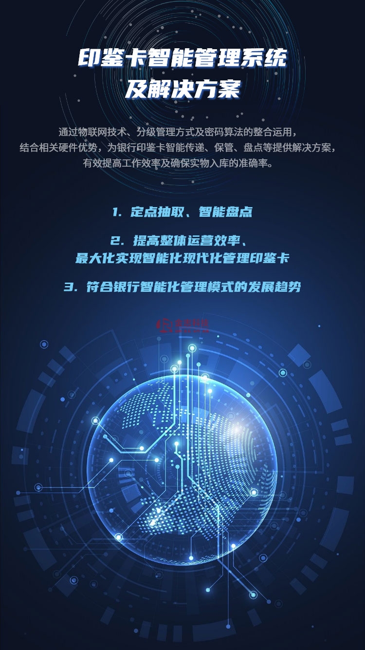 通過物聯(lián)網(wǎng)技術(shù)、分級管理方式及密碼算法的整合運(yùn)用,結(jié)合相關(guān)硬件優(yōu)勢,為銀行印鑒卡智能傳遞、保管、盤點(diǎn)等提供解決方案,有效提高工作效率及確保實(shí)物入庫的準(zhǔn)確率。